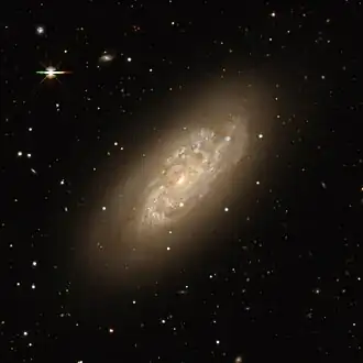 The morphological classification of this galaxy in the de Vaucouleurs system is SA(rs)bc,[5] indicating a spiral galaxy with no central bar (SA), moderately wound arms (bc), and an incomplete ring structure.[5] However, the HyperLEDA classification of SBbc suggests it does have a bar. It has a flocculent appearance with no central bulge.[7] In the B-band, the angular extend of the galaxy spans 7′.5 × 3′.1. The plane of the galaxy is inclined at an angle of 66° to the line of sight from the Earth, with the major axis being aligned along a position angle of 317°.[4]