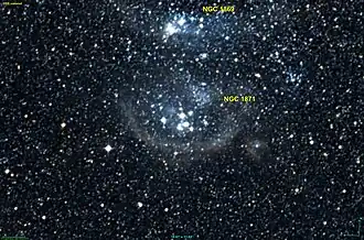 NGC 1871 (also known as ESO 56-SC85) is an open cluster associated with an emission nebula located in the Dorado constellation within the Large Magellanic Cloud. It was discovered by James Dunlop on November 5, 1826. Its apparent magnitude is 10.21, and its size is 2.0 arc minutes.[2][3]