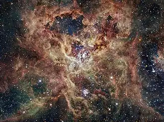 NGC 2070 (also known as Caldwell 103) is a large open cluster and candidate super star cluster forming the heart of the bright region in the centre-south-east of the Large Magellanic Cloud.[2] This cluster was discovered by French astronomer Nicolas-Louis de Lacaille in 1752.[3] It is at the centre of the Tarantula Nebula and produces most of the energy that makes the latter's gas and dust visible. Its central condensation is the star cluster R136, one of the most energetic star clusters known.[4] Among its stars are many of great dimension, including the second most massive star known, R136a1, at 215 M☉ and 6.16 million L☉.