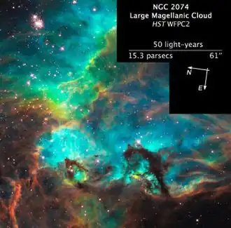 NGC 2074 is a magnitude ~8 emission nebula in the Tarantula Nebula located in the constellation Dorado. It was discovered on 3 August 1826 by James Dunlop and around 1835 by John Herschel. It is described as being "pretty bright, pretty large, much extended, [and having] 5 stars involved".[3]