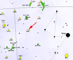 NGC 2360 (also known as Caroline's Cluster[3] or Caldwell 58) is an open cluster in the constellation Canis Major. It was discovered on 26 February 1783[4] by Caroline Herschel, who described it as a "beautiful cluster of pretty compressed stars near 1/2 degree in diameter".[5] Her notes were overlooked until her brother William included the cluster in his 1786 catalogue of 1000 clusters and nebulae and acknowledged her as the discoverer.[4] The cluster lies 3.5 degrees east of Gamma Canis Majoris and less than one degree northwest of the eclipsing binary star R Canis Majoris; it has a combined apparent magnitude of 7.2.[5] It is 13 arc minutes in diameter.[2] By the western edge of the cluster is the unrelated star, 5.5-magnitude HD 56405.[6]