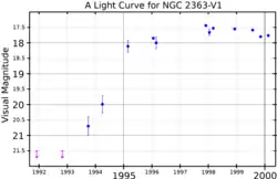 - 1 2 3 Petit, Véronique; Drissen, Laurent; Crowther, Paul A. (2006). "Spectral Evolution of the Luminous Blue Variable NGC 2363-V1. I. Observations and Qualitative Analysis of the Ongoing Giant Eruption". The Astronomical Journal. 132 (5): 1756. Bibcode:2006AJ....132.1756P. doi:10.1086/506512.