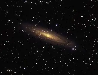 NGC 2613 is a spiral galaxy in the southern constellation of Pyxis, next to the western constellation border with Puppis. It was discovered by the German-born astronomer William Herschel on November 20, 1784.[8] With an apparent visual magnitude of 10.5, the galaxy is faintly visible using a telescope with a 100 mm (4 in) aperture. It appears spindle-shaped as it is almost edge-on to observers on Earth.[9]