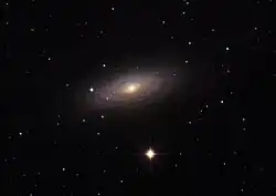 NGC 2841 is an unbarred spiral galaxy in the northern circumpolar constellation of Ursa Major. It was discovered on 9 March, 1788 by German-born astronomer William Herschel. J. L. E. Dreyer, the author of the New General Catalogue, described it as, "very bright, large, very much extended 151°, very suddenly much brighter middle equal to 10th magnitude star".[7] Initially thought to be about 30 million light-years distant, a 2001 Hubble Space Telescope survey of the galaxy's Cepheid variables determined its distance to be approximately 14.1 megaparsecs or 46 million light-years.[4] The optical size of the galaxy is 8.1′ × 3.5′.[6]