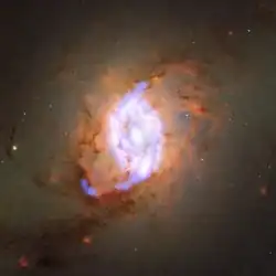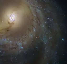 The galaxy has a morphological classification of SB(r)b,[1] with the SBb notation indicating it is a barred spiral with arms that are intermediate on the scale from tightly to loosely wound, and an "(r)" meaning an inner ring surrounds the bar.[4] The latter is a ring-shaped, circumnuclear star-forming region with a diameter of approximately 70,000 light-years (21,000 pc).[5] The spiral structure extends outward from the ring.[4]