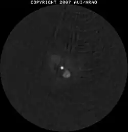 When observed in radio waves, the galaxy features two radio lobes extending from a nuclear source, a feature common to Seyfert 2 galaxies. The emission of the southwest lobe is polarised, indicating it is above the plain of the disk, while the northeast is depolarised. The southwest lobe extends 26" from the nucleus and the northeast 33". The total extent of the source is approximately 12 kpc at the distance of the galaxy.[13] More detailed observations by the Very Large Array revealed a radio jet connecting the nucleus with the southwest lobe and a circumnuclear structure with a radius of nearly 300 pc.[14]