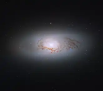 NGC 3489 has a weak bar, seen along the minor axis, and a small bulge.[5] The age of the stellar population in NGC 3489 shows a gradient, with the younger stars lying closer to the core. When observed in H-beta, the central arcsecond of NGC 3489 shows a peak, indicating the presence of younger stars at the core, whose age is estimated to be about 1.7 Gys.[6] Although currently NGC 3489 is considered a post-starburst galaxy, there is still molecular gas in the nucleus that can lead to star formation, although its mass is less than what is found in galaxies with active star formation.[7] In the nuclear region of NGC 3489 has been observed dust with an open spiral pattern.[6] The galaxy has an outer ring structure, with a diameter of 1.54 arcminutes along the major axis.[8]