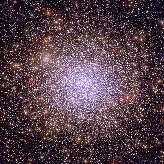NGC 419 is a globular cluster located approximately 57,000 pc (190,000 ly) from Earth in the constellation Tucana. It was discovered on September 2, 1826, by James Dunlop. It was described by Dreyer as "pretty large, pretty bright, round, gradually brighter middle".[4] At a distance of about 186,000 light years (57,000 parsecs), it is located within the Small Magellanic Cloud.[2] At an aperture of 50 arcseconds, its apparent V-band magnitude is 10.30, but at this wavelength, it has 0.15 magnitudes of interstellar extinction.[3]