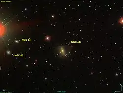 NGC 447 is a spiral galaxy of type (R)SB(rs)0/a located in the constellation Pisces. It was first discovered on October 8, 1861 by Heinrich d'Arrest (and later listed as NGC 447); it was also seen in the 1890s by Edward Emerson Barnard (and later listed as IC 1656). It was described by Dreyer as "faint, pretty large, brighter middle, 11th magnitude star to northeast."[2]