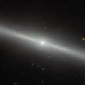 NGC 4762 is an edge-on lenticular galaxy in the constellation Virgo. It is at a distance of 60 million light years and is a member of the Virgo Cluster. The edge-on view of this particular galaxy, originally considered to be a barred spiral galaxy, makes it difficult to determine its true shape, but it is considered that the galaxy consists of four main components — a central bulge, a bar, a thick disc and an outer ring. The galaxy's disc is asymmetric and warped, which could be explained by NGC 4762 merging with a smaller galaxy in the past. The remains of this former companion may then have settled within NGC 4762's disc, redistributing the gas and stars and so changing the disc's morphology.[2]