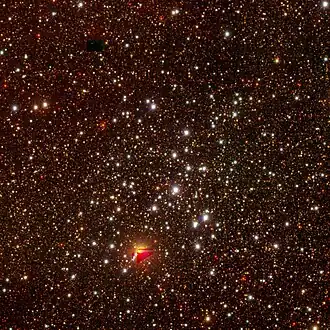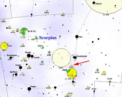 NGC 6242 is an open cluster of stars in the southern constellation Scorpius. It can be viewed with binoculars or a telescope at about 1.5° to the south-southeast of the double star Mu Scorpii.[3] This cluster was discovered by French astronomer Nicolas-Louis de Lacaille in 1752 from South Africa.[5] It is located at a distance of approximately 4,350 ly (1,335 pc) from the Sun,[2] just to the north of the Sco OB 1 association.[6] The cluster has an estimated age of 77.6 million years.[2]