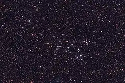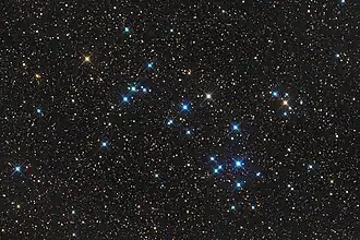 NGC 6633 is a large bright open cluster in the constellation Ophiuchus. Discovered in 1745-46 by Philippe Loys de Chéseaux, it was independently rediscovered by Caroline Herschel in 1783 and included in her brother William's catalog as H VIII.72.[1] Bright enough to be seen with the naked eye, the cluster is considered a fine object for binoculars or small telescopes.[2]