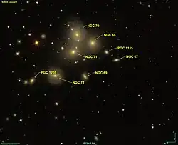 VV 166, sometimes also called the NGC 70 galaxy group or Arp 113, is a cluster of galaxies in Andromeda. The main group was discovered in 1784 by William Herschel, who listed the galaxies as a single object. Later, in the 1880s, John Louis Emil Dreyer managed to discern some of the galaxies in this region and cataloged them.[2] The prominent elliptical galaxy in the region, NGC 68, is probably not a member of the group.