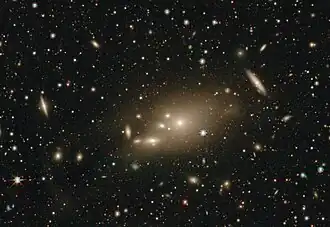 NGC 7012 is a large, bright[2] elliptical galaxy located about 380 million light-years away from Earth in the constellation Microscopium.[3][4] NGC 7012 was discovered by astronomer John Herschel on July 1, 1834.[5] NGC 7012 is host to a supermassive black hole with an estimated mass of 4.5 × 109 M.[6] NGC 7012 is very large galaxy, with an estimated diameter of nearly 300,000 light years.[4]