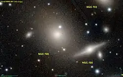 NGC 708 may be interacting with NGC 705 which lies about 67,000 ly (20.6 kpc) to the south-west.[21]