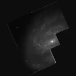 In the centre of NGC 7418 is believed to lie a supermassive black hole with an estimated mass between 1 and 15 million (106.58 ± 0.59) M☉, based on the spiral pitch angle.[5] The centre of the galaxy has also been found to host a massive stellar cluster, with an estimated mass of nearly 60 million (107.78 ± 0.19) M☉.[6] The existence of this nuclear star cluster doesn't rule out the existence of a supermassive black hole. Galaxies like the Milky Way and the Andromeda Galaxy have been found to host both.[5] The stellar population at the nucleus of NGC 7418 has been found to be quite young, with mean age less than 100 million years, indicating recent star forming activity.[7]
