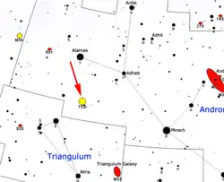 NGC 752 (also known as Caldwell 28) is an open cluster in the constellation Andromeda. The cluster was discovered by Caroline Herschel in 1783 and cataloged by her brother William Herschel in 1786, although an object that may have been NGC 752 was described by Giovanni Batista Hodierna before 1654.[4]