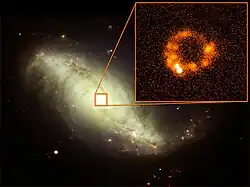 The ring is brighter north of the nucleus and there is inhabited by the younger star populations.[7] Brandl et al. detected in near- and mid-infrared nine prominent structures within the ring they identified as star clusters with stellar ages ranging between 5.5 Myr and 6.3 Myr. These clusters account for the 75% of the bolometric luminosity of the starburst ring, with total luminosity of the clusters 2.1 × 1010 L⊙.[4] Numerous supernova remnants have been observed in the ring. Further observations of the galaxy in radio waves showed that NGC 7552 contains three star forming rings of radii 1.0 kpc, 1.9 kpc, and 3.4 kpc as observed by the Very Large Array at 46.9 MHz and the Australia Telescope Compact Array.[11]