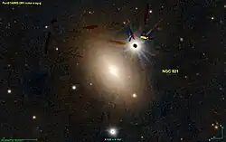 NGC 821 is an elliptical galaxy in the constellation Aries. It is estimated to be about 80 million light-years from the Milky Way[3] and has a diameter of approximately 55,000 light years. NGC 821 was discovered on September 4, 1786, by astronomer Wilhelm Herschel.[4][5][6]