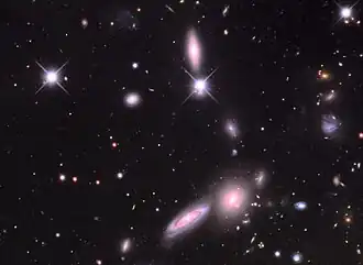 NGC 85 is an interacting spiral or lenticular galaxy estimated to be about 200 million light-years away in the constellation of Andromeda. It was discovered by Ralph Copeland in 1873 and its apparent magnitude is 15.7.[4] The galaxy appears to be interacting with the companion spiral IC 1546.