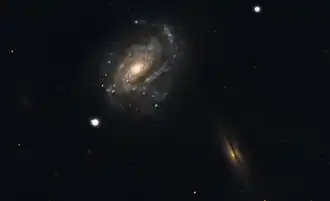 NGC 877 forms a pair with the edge-on spiral galaxy NGC 876, which lies 2.1 arcminutes to the southwest. At the distance of NGC 877, this corresponds to a projected distance of 30 kpc.[4] A low surface brightness bridge connects the two galaxies.[5] NGC 870 and NGC 871 are two other nearby galaxies.[4] NGC 877 is the brightest and most massive member of a galaxy group known as the NGC 877 group or LGG (Lyon Groups of Galaxies) 53. Other members of the group include NGC 876 and NGC 871, as well as UGC 1693, IC 1791, UGC 1773, and UGC 1817.[12] The group contains large amounts of HI gas.[13]