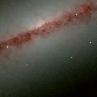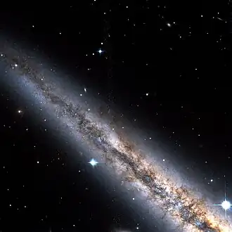 NGC 891 looks as the Milky Way would look like when viewed edge-on (some astronomers have even noted how similar to NGC 891 our galaxy looks as seen from the Southern Hemisphere[9]) and, in fact, both galaxies are considered very similar in terms of luminosity and size;[10] studies of the dynamics of its molecular hydrogen have also proven the likely presence of a central bar.[11] Despite this, recent high-resolution images of its dusty disk show unusual filamentary patterns. These patterns are extending into the halo of the galaxy, away from its galactic disk. Scientists presume that supernova explosions caused this interstellar dust to be thrown out of the galactic disk toward the halo.[12]
