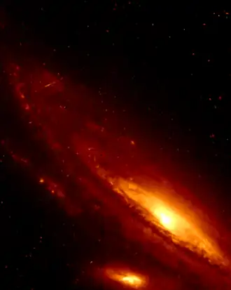 A smaller companion galaxy, measuring 0.2 by 0.1 arcminutes, is superimposed on the galaxy, lying about 0.35 arcminutes towards the north.[16]