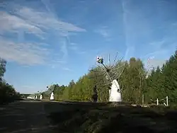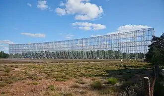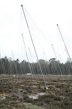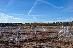 CODALEMA (Cosmic ray Detection Array with Logarithmic ElectroMagnetic Antennas) is a set of instruments to try and detect ultra-high energy cosmic rays, which cause cascades of particles in the atmosphere. These air showers generate very brief electromagnetic signals that are measured in a wide frequency band from 20 MHz to 200 MHz. An array of about 50 antennas is spread over a large area of the site.[7]