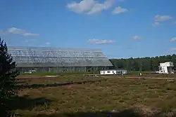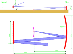 The large radio telescope is a transit telescope of the Kraus-type design. The primary mirror at the north end of the installation is a planar mirror measuring 200 m in width and 40 m in height. This is tiltable to adjust to the altitude of the observed object. It consists of five 20 m wide segments, each of 40 t mass. The radio waves are reflected horizontally into the secondary mirror 460 m to the South. The shape of the secondary is that of a segment of a sphere 300 m wide and 35 m high. The secondary reflects the radio waves back into its focal point 280 m to its North and about 60% the distance back to the primary. A cabin with further mirrors and the receiver is located at the focus. During an observation, the cabin is moved west to east to track the observed object for about an hour around its transit through the meridian.[4][1]