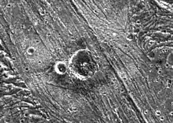 Nergal crater is a crater on Jupiter's moon Ganymede. It has a distinctive ejecta blanket surrounding it that's darker nearer the craters and brighter further away. The inner region of the ejecta is characterized by a lobate appearance indicative of the flow of a liquid (or slushy) substance over the surface. The flow was probably icy surface material melted by the energy released during the impact that formed the crater.[1]