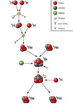 There are two main processes for stellar nuclear fusion. The first is the Proton-Proton (PP) chain, in which protons are fused together into helium, sometimes temporarily creating the heavier elements of lithium, beryllium, and boron along the way. The second is the CNO cycle, in which carbon, nitrogen, and oxygen are fused with protons, and then undergo alpha decay (helium nucleus emission) to begin the cycle again. The PP chain is the primary process in the Sun, while the CNO cycle is more dominant in stars more massive than the Sun.[27]