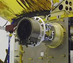 The RTG, model "GPHS-RTG", was originally a spare from the Cassini mission. The RTG contains 9.75 kg (21.5 lb) of plutonium-238 oxide pellets.[31] Each pellet is clad in iridium, then encased in a graphite shell. It was developed by the U.S. Department of Energy at the Materials and Fuels Complex, a part of the Idaho National Laboratory.[58] The original RTG design called for 10.9 kg (24 lb) of plutonium, but a unit less powerful than the original design goal was produced because of delays at the United States Department of Energy, including security activities, that delayed plutonium production.[59] The mission parameters and observation sequence had to be modified for the reduced wattage; still, not all instruments can operate simultaneously. The Department of Energy transferred the space battery program from Ohio to Argonne in 2002 because of security concerns.