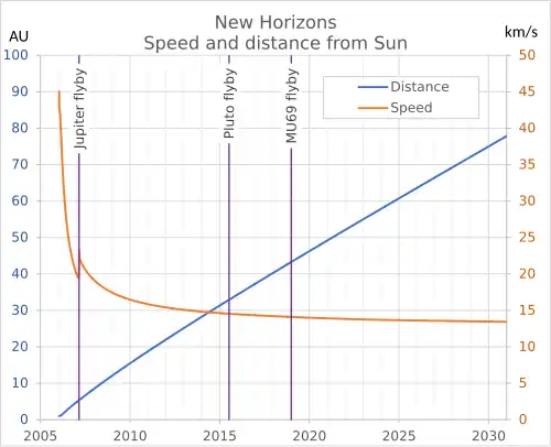 On January 19, 2006, New Horizons was launched from Cape Canaveral Air Force Station by an Atlas V rocket directly into an Earth-and-solar escape trajectory with a speed of about 16.26 km/s (10.10 mi/s; 58,500 km/h; 36,400 mph). It was the fastest (average speed with respect to Earth) human-made object ever launched from Earth.[7][8][9][10] It is not the fastest speed recorded for a spacecraft, which, as of 2023, is that of the Parker Solar Probe. After a brief encounter with asteroid 132524 APL, New Horizons proceeded to Jupiter, making its closest approach on February 28, 2007, at a distance of 2.3 million kilometers (1.4 million miles). The Jupiter flyby provided a gravity assist that increased New Horizons' speed; the flyby also enabled a general test of New Horizons' scientific capabilities, returning data about the planet's atmosphere, moons, and magnetosphere.