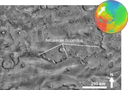 Nilokeras Scopulus is a long escarpment (cliff) in the northern hemisphere of the planet Mars. It is located along the southeastern boundary of the Tempe Terra plateau and forms the northern valley wall (wallrock boundary) of the downstream portion of the immense Kasei Valles outflow channel system. The escarpment is 765 km long[1] and ranges from 1 to a little over 2 km (3300–6600 ft) in height.[2]