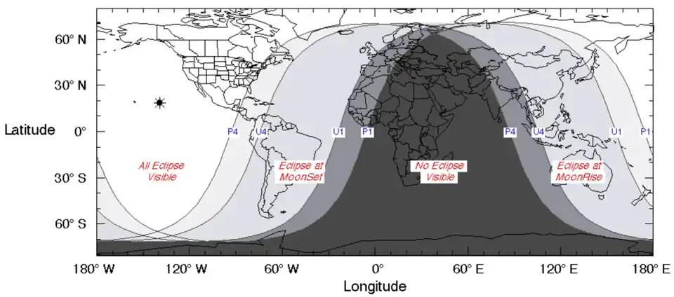 The eclipse was completely visible over northeast Asia, the Pacific Ocean, and North America, seen rising over east Asia and Australia and setting over South America.[6]