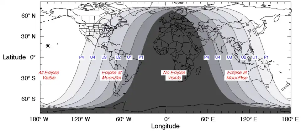 The eclipse was completely visible over northeast Asia and North America, seen rising over Asia and Australia and setting over eastern North America and South America.[12]