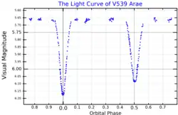 - ↑ Knipe, G. F. G. (September 1971), "The light curve and orbital elements of V539 Arae", Astronomy & Astrophysics, 14: 70–77, Bibcode:1971A&A....14...70K.