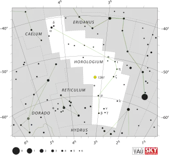 Nu Horologii, Latinized from ν Horologii, is the Bayer designation for a single[11] star in the southern constellation of Horologium. It was catalogued by the Dutch explorer Frederick de Houtman in 1603.[12] With an apparent visual magnitude of 5.3,[2] this star can be seen with the naked eye from the southern hemisphere. (According to the Bortle scale, it can be seen at night from bright suburban skies.) Based upon parallax, Nu Horologii lies at a distance of 169 light-years from Earth.[1] It is drifting closer to the Sun with a radial velocity of +31 km/s.[5]