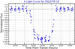 A light curve for OGLE-TR-10 showing the planet transit, adapted from Pont et al. (2007)[4]