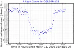 In 2003 the Optical Gravitational Lensing Experiment (OGLE) detected periodic dimming in the star's light curve indicating a transiting, planetary-sized object.[1] Since low-mass red dwarfs and brown dwarfs may mimic a planet radial velocity measurements were necessary to calculate the mass of the body. In 2004 the object was proved to be a new transiting extrasolar planet, OGLE-TR-132b.[3]