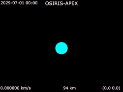 On 25 April 2022, NASA confirmed that the mission would be extended. After dropping off its sample to Earth on 24 September 2023, the mission became OSIRIS-APEX ('APophis EXplorer').[77] As the new name suggests, its next target will be the near-Earth asteroid (and potentially hazardous object) 99942 Apophis. Apophis will make an extremely close pass to the Earth on 13 April 2029, although there is no chance for an impact during this or any subsequent flybys in the near future. Observations of Apophis will commence on 8 April 2029, and a few days later, on 21 April, OSIRIS-APEX is planned to rendezvous with the asteroid.[90] OSIRIS-APEX will orbit Apophis for around 18 months in a regime similar to that at Bennu. The spacecraft will perform a maneuver, similar to sample collection at Bennu, by using its thrusters to disturb Apophis's surface, in order to expose and spectrally study the subsurface and the material beneath it.[16]