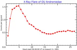 OU Andromedae is a bright X-ray source, due to the activity of its corona; it's estimated that solar-like active regions cover 30% of the surface. This is another effect of the strong magnetic field, which produces an uninterrupted flaring activity that generates a large volume of hot plasma at coronal temperatures (~7.5×106 K).[11]