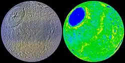 ![]() Tethys, with Odysseus at the top, as imaged by Cassini on February 14, 2010 | |