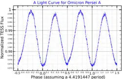 Omicron Persei A is a spectroscopic binary consisting of a spectral type B1 giant and a type B2 dwarf orbiting each other every 4.4 days. The orbit is near-circular although its inclination is not precisely known. The two stars are separated by approximately 33 R☉, the exact value depending on the inclination. The primary is approximately one magnitude brighter than the secondary at visual wavelengths.[5] The binary pair forms a rotating ellipsoidal variable star, which varies in brightness from visual magnitude 3.79 to 3.88 during the orbital period.[20]