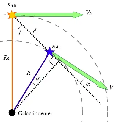 Consider a star in the midplane of the Galactic disk with Galactic longitude at a distance from the Sun. Assume that both the star and the Sun have circular orbits around the center of the Galaxy at radii of and from the Galactic Center and rotational velocities of and , respectively. The motion of the star along our line of sight, or radial velocity, and motion of the star across the plane of the sky, or transverse velocity, as observed from the position of the Sun are then: