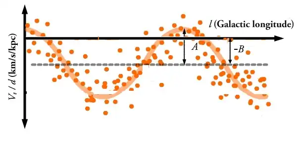 Since the non-circular component of the Sun's velocity is known, it can be subtracted out from our observations to compensate. We do not know, however, the non-circular components of the velocity of each individual star we observe, so they cannot be compensated for in this way. But, if we plot transverse velocity divided by distance against galactic longitude for a large sample of stars, we know from the equations above that they will follow a sine function. The non-circular velocities will introduce scatter around this line, but with a large enough sample the true function can be fit for and the values of the Oort constants measured, as shown in figure 2. is simply the amplitude of the sinusoid and is the vertical offset from zero. Measuring transverse velocities and distances accurately and without biases remains challenging, though, and sets of derived values for and frequently disagree.