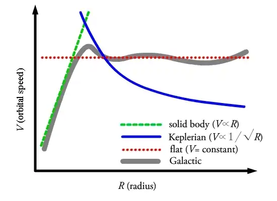 To begin, let one assume that the rotation of the Milky Way can be described by solid body rotation, as shown by the green curve in Figure 3. Solid body rotation assumes that the entire system is moving as a rigid body with no differential rotation. This results in a constant angular velocity, , which is independent of . Following this we can see that velocity scales linearly with , , thus