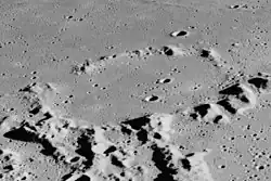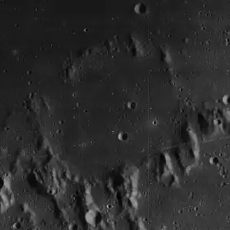 Oppolzer is the remnant of a lunar impact crater that is located on the southern edge of Sinus Medii, along the meridian of the Moon. Its diameter is 41 km. It was named after the Austrian astronomer Theodor von Oppolzer.[1] It is located within one crater diameter of the origin of the selenographic coordinate system at 0° N, 0° W. Attached to the surviving remnants of the southeast rim is the crater Réaumur. To the west-southwest is the lava-flooded walled plain Flammarion.