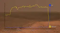 The final communication from the rover came on June 10, 2018 (sol 5111) from Perseverance Valley,[16] and indicated a solar array energy production of 22 Watt-hours for the sol, and the highest atmospheric opacity (tau) ever measured on Mars: 10.8.[38]