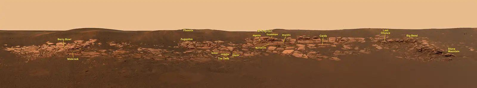 On February 19 the survey of "Opportunity Ledge" was declared successful. A specific target in the outcrop (dubbed "El Capitan"), whose upper and lower portions appeared to differ in layering and weathering characteristics, was selected for further investigation. El Capitan, about 10 centimeters (3.9 in) high, was named after a mountain in Texas.[8] Opportunity reached El Capitan on Sol 27, and took a first picture of the rocks with its panoramic camera.